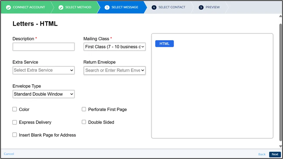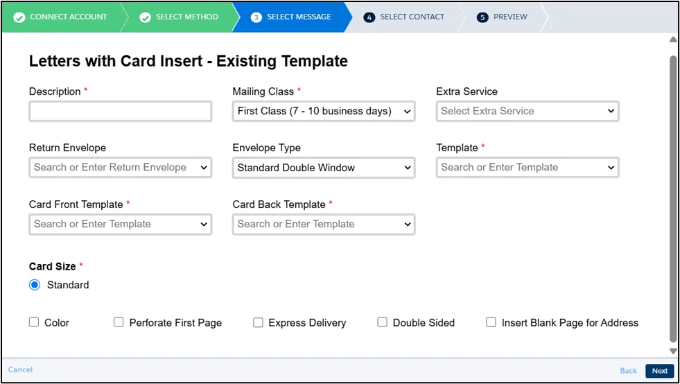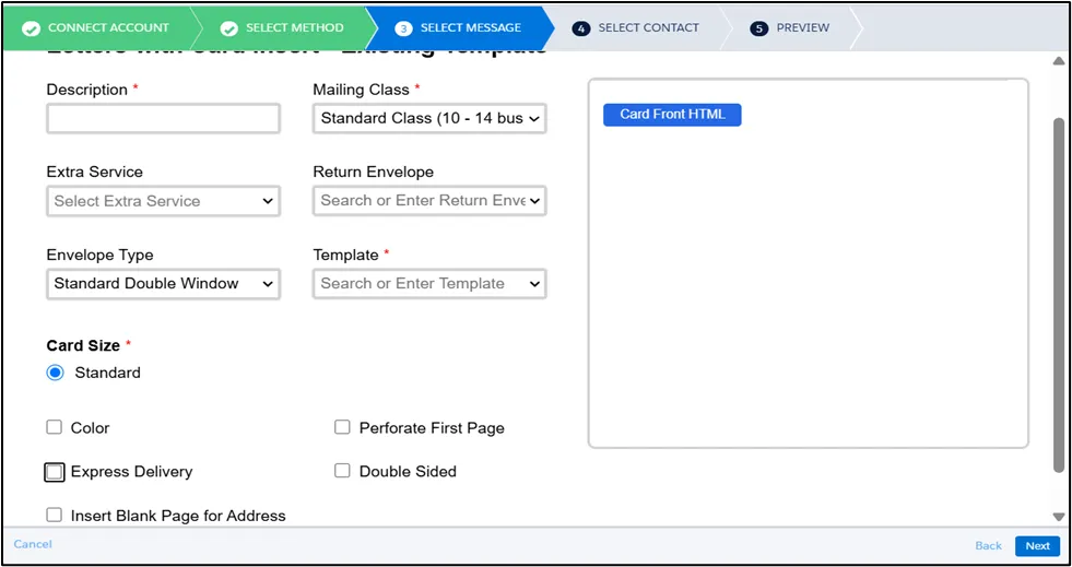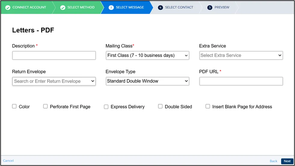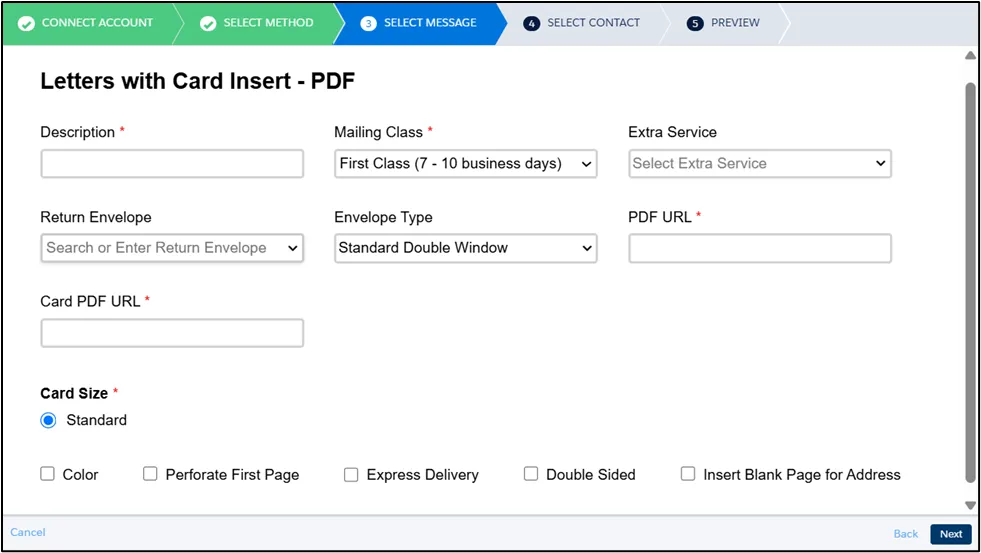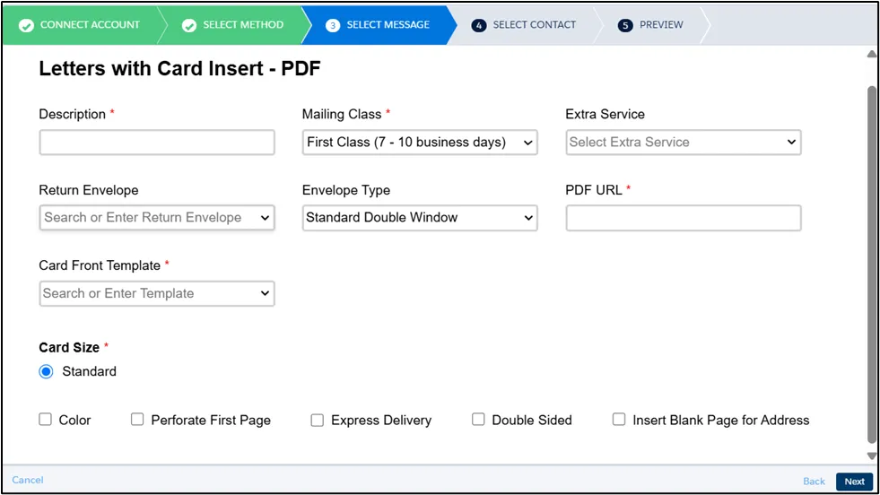 Section titled “Message Setting”For letters, in addition to fill in the required fields like Description and Mailing Class, You can also configure additional options, including: