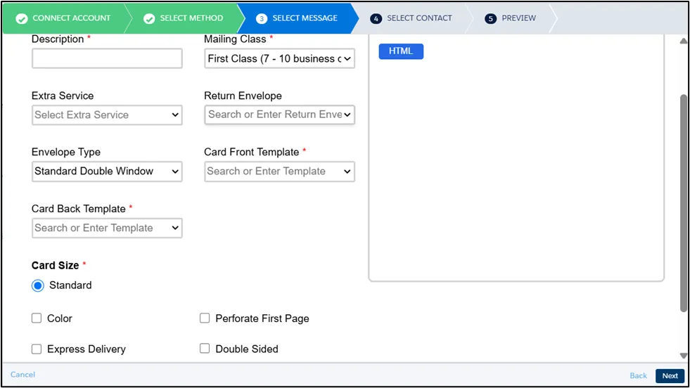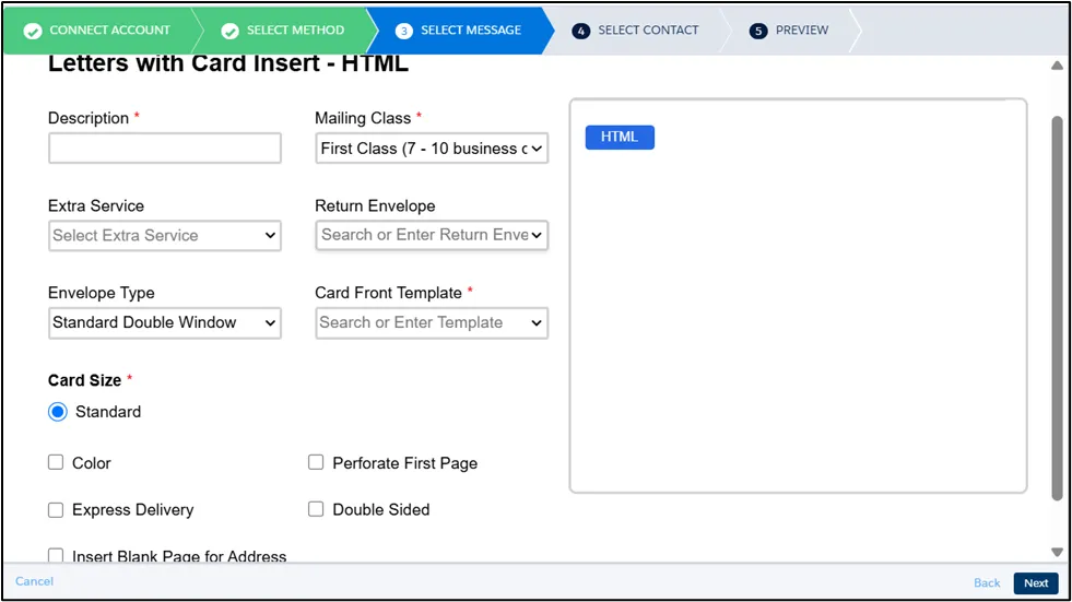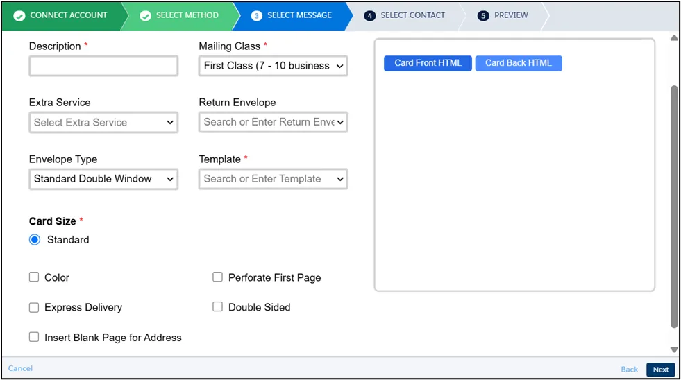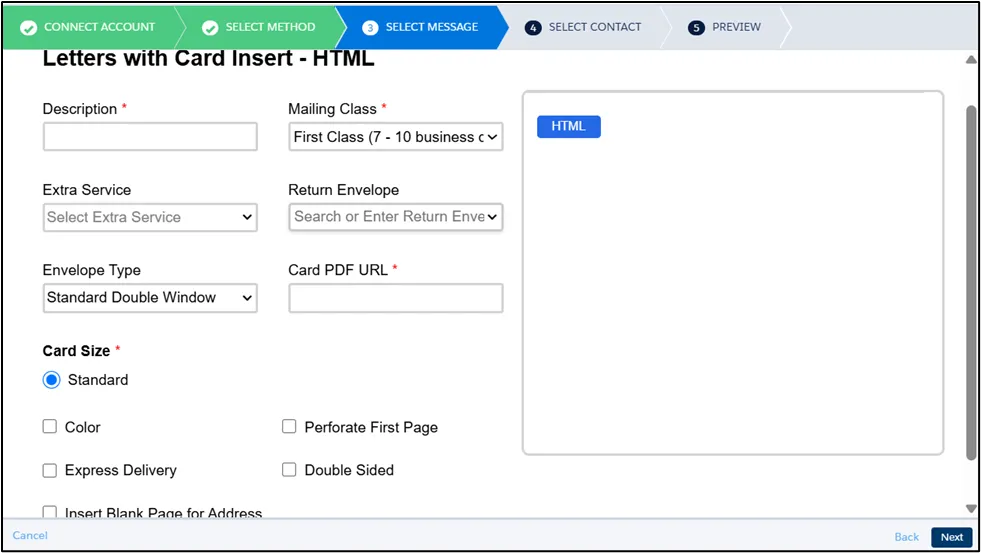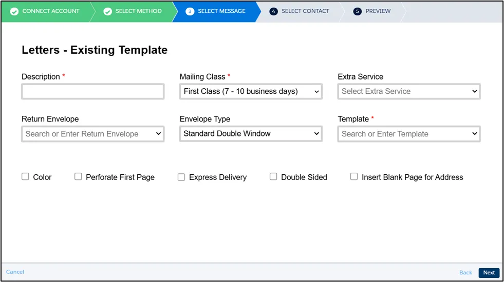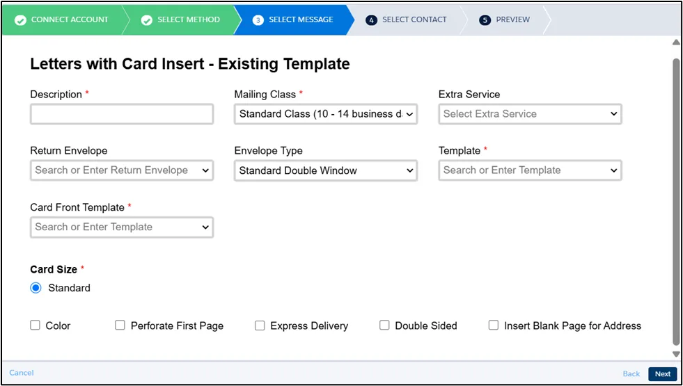 Section titled “Message Setting”For letters, in addition to fill in the required fields like Description and Mailing Class, You can also configure additional options, including: