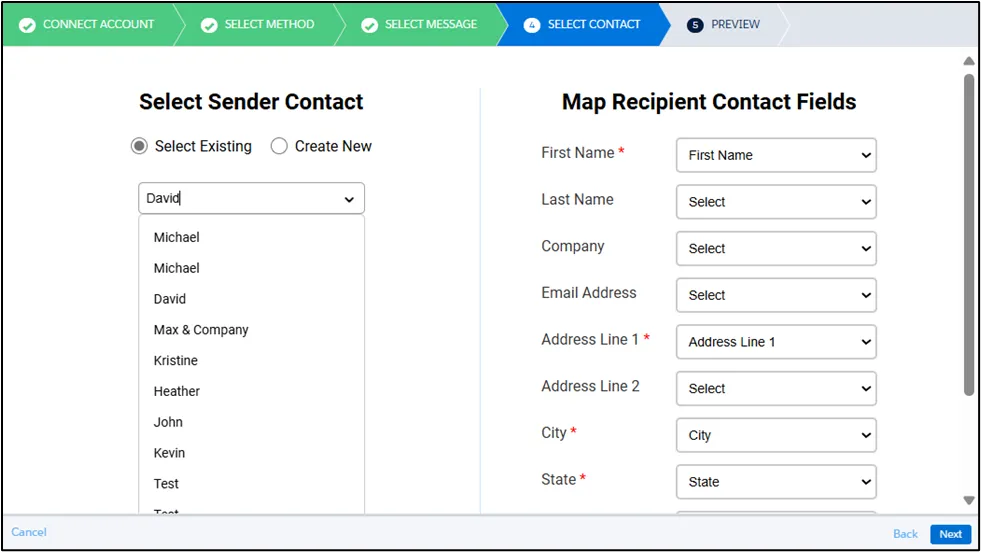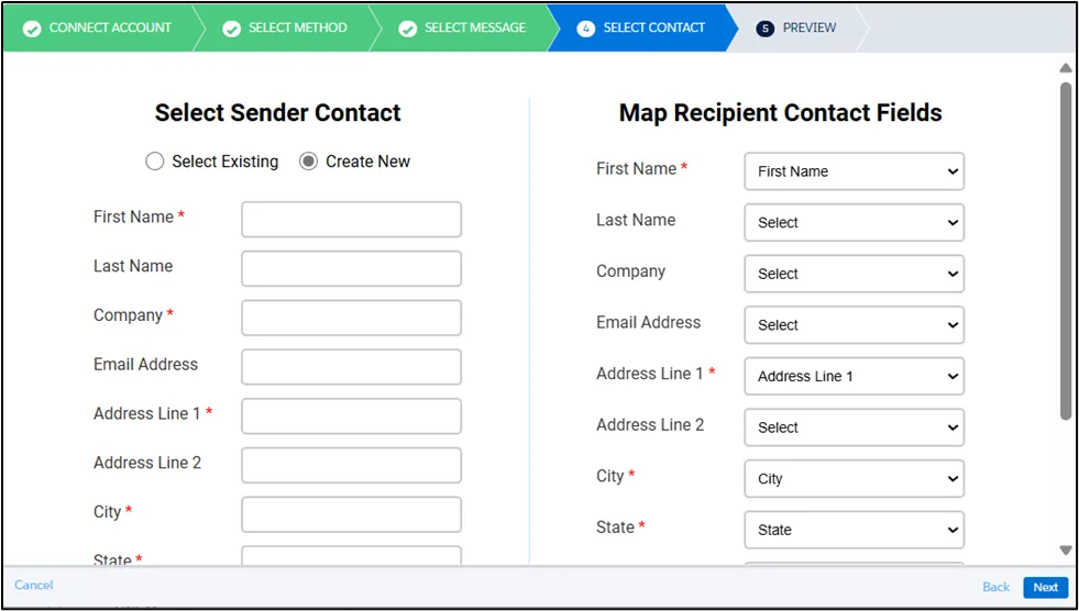 For the Sender Contact, you can either select an existing contact or create a new one as needed. Once mapping is complete, click Next to proceed.