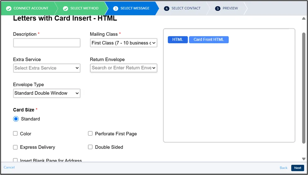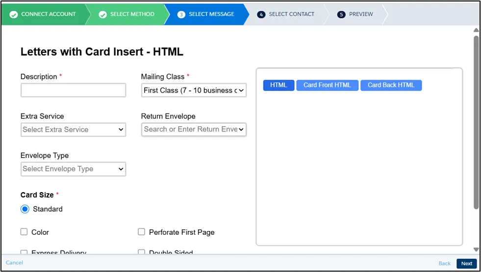 Section titled “HTML Letter and HTML Card Insert”In addition to the HTML Code for the letter, you may also need to provide a Card Front HTML Code, or both Card Front and Card Back HTML Codes, depending on your selected insert configuration, as shown below.
