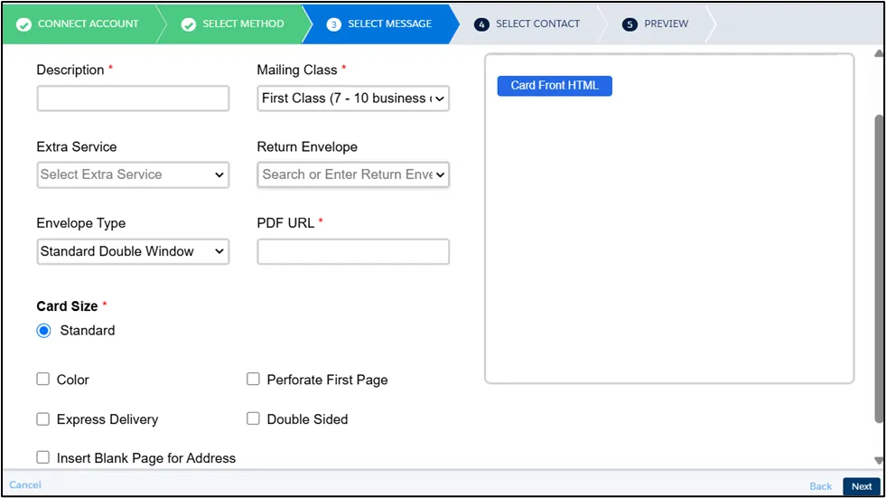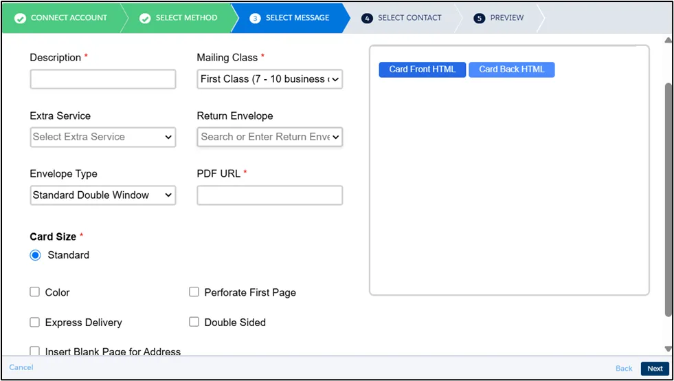 Section titled “PDF Letter and HTML Card Insert”In addition to the PDF URL for the letter, you may also need to provide a Card Front HTML Code, or both Card Front and Card Back HTML Codes, depending on your selected insert configuration, as shown below.