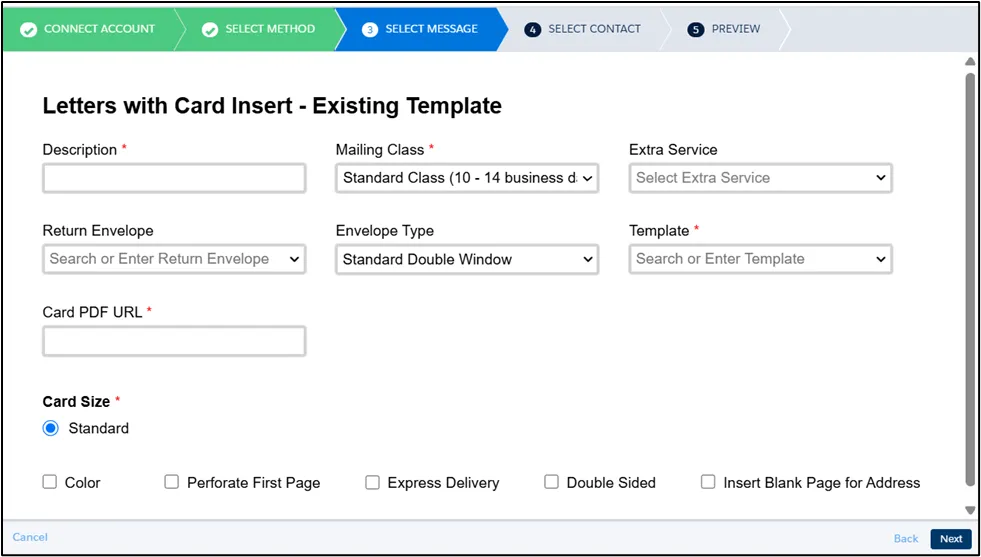 Section titled “PDF Letter and Existing Template for Card Insert”In addition to the PDF URL for the letter, you may also need to provide a Card Front Template, or both Card Front and Card Back Template, depending on your selected insert configuration, as shown below.