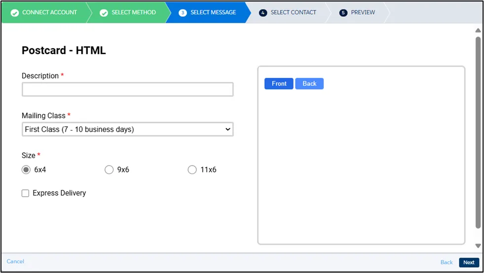 If you selected Postcard as your Message Format, Step 3 will appear in one of the following variations, depending on the chosen Design Format of HTML, PDF, or Existing Template.
