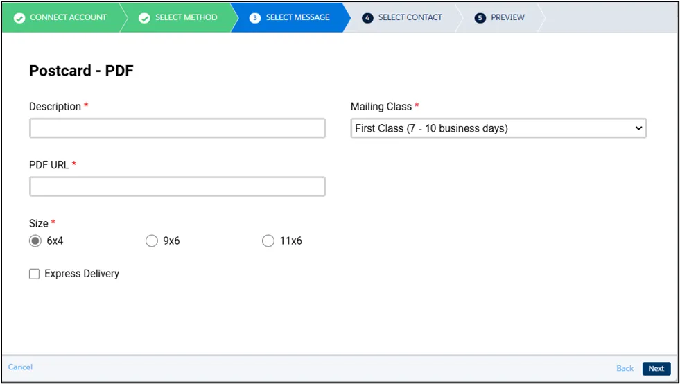 For PDF, fill in the required fields like Description, Mailing Class, and PDF URL which should be publicly accessible, and selecting a Size for the postcard.