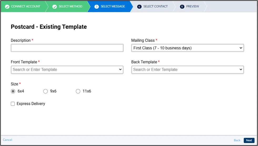 Section titled “Existing Template”For Existing Template, fill in the required fields like Description, Mailing Class, and Front Template and Back Template, and selecting a Size for the postcard
