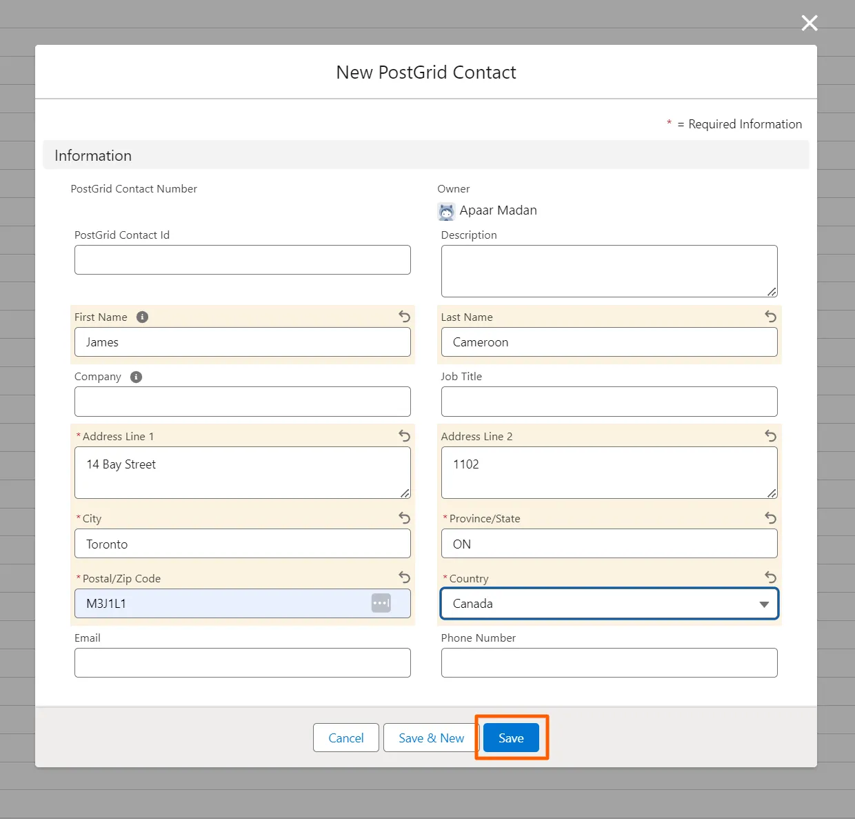 Section titled “Creating a new contact”1. Click on “PostGrid Contacts” and then click on “New”
