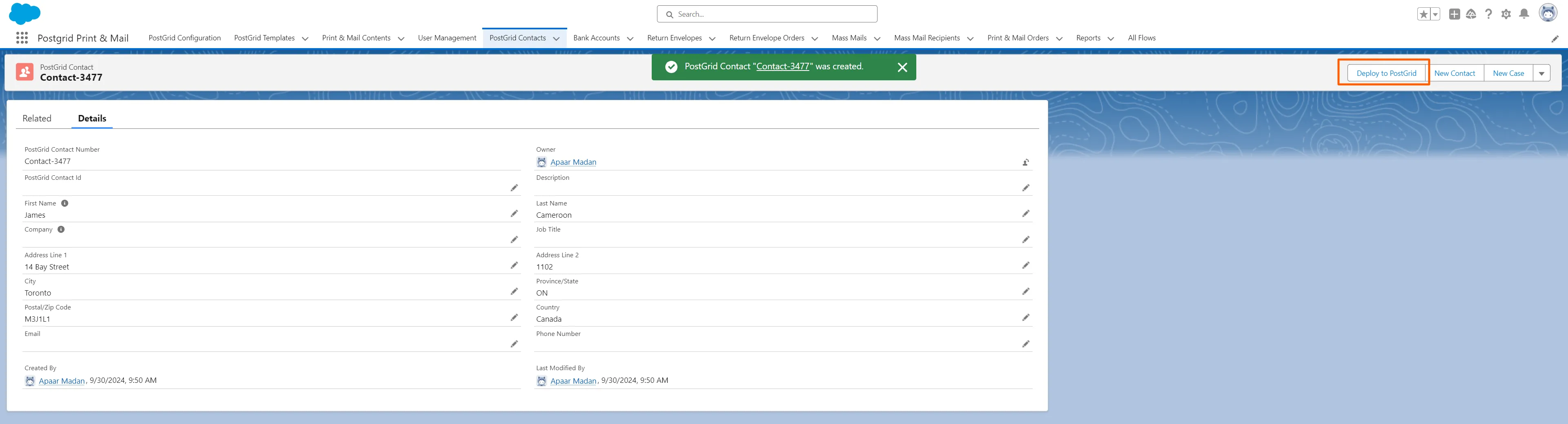 Section titled “3. Click on “Deploy to PostGrid” to add the contact to the PostGrid dashboard”