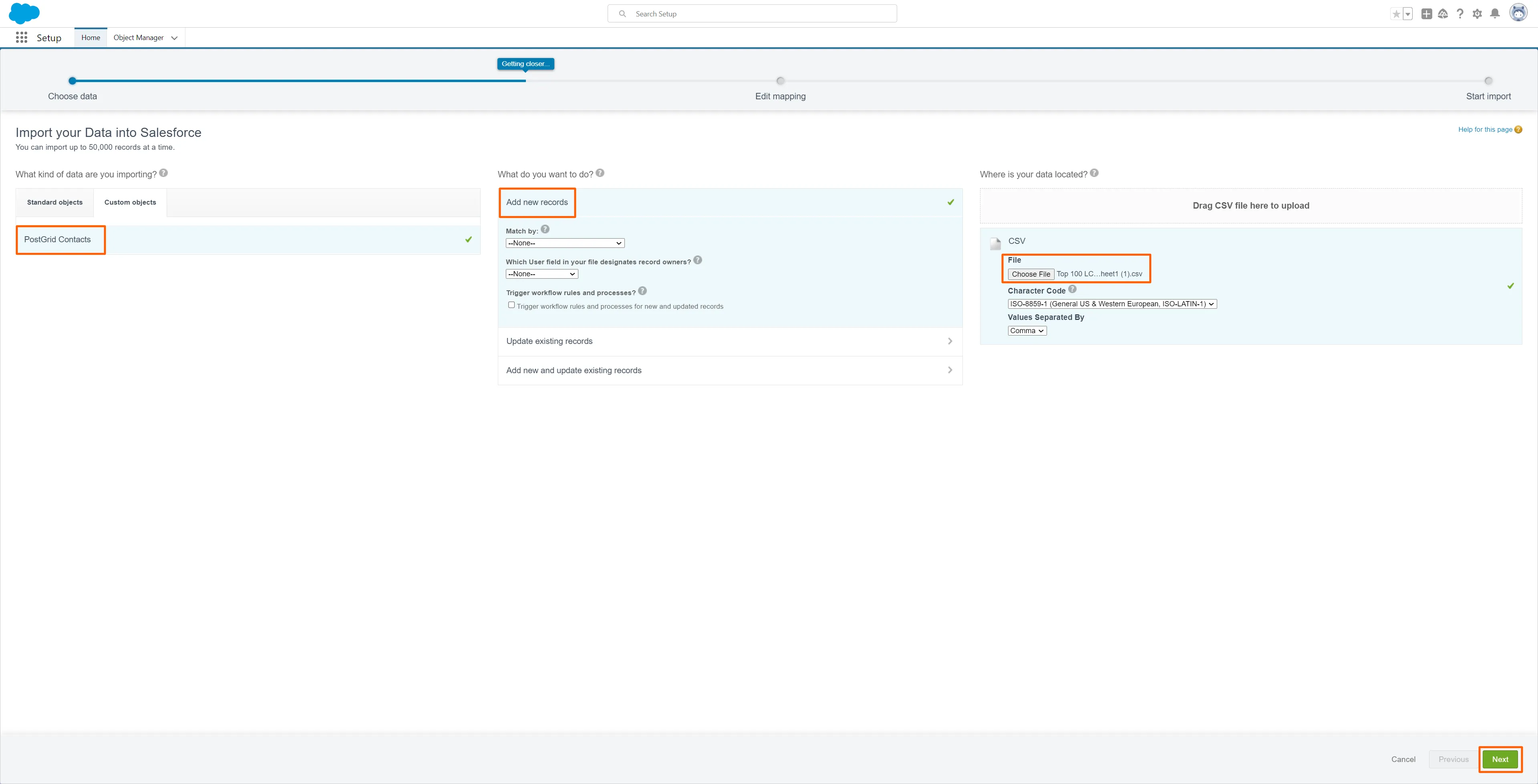 Section titled “2. Click on “PostGrid Contacts” under Custom Objects. Next, click on “Add new Records””- Because you are adding new records, you don’t have to do the mapping for “Match by”, “Which User field in your file designates record owners?” and “Trigger workflow rules and processes?”