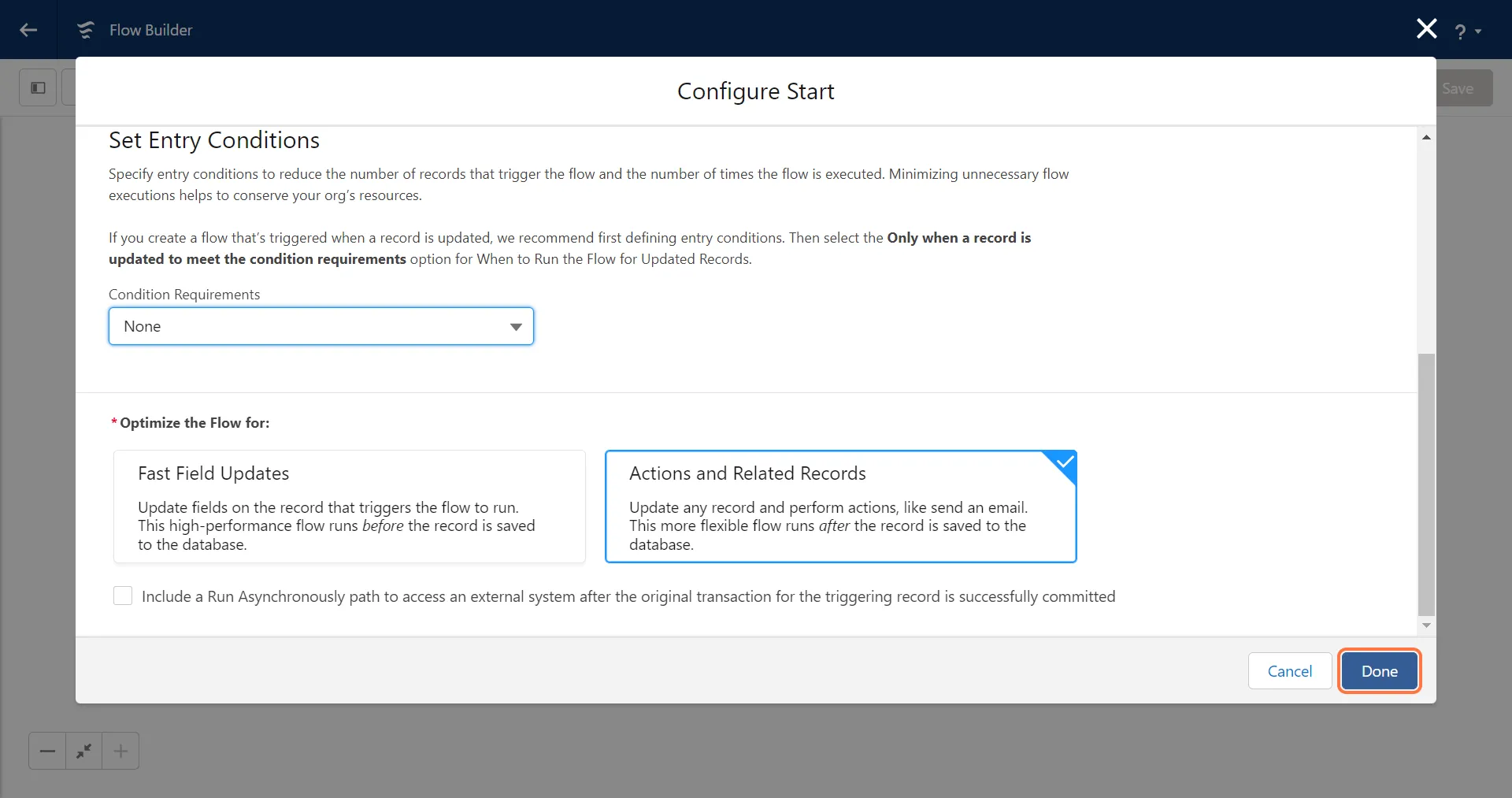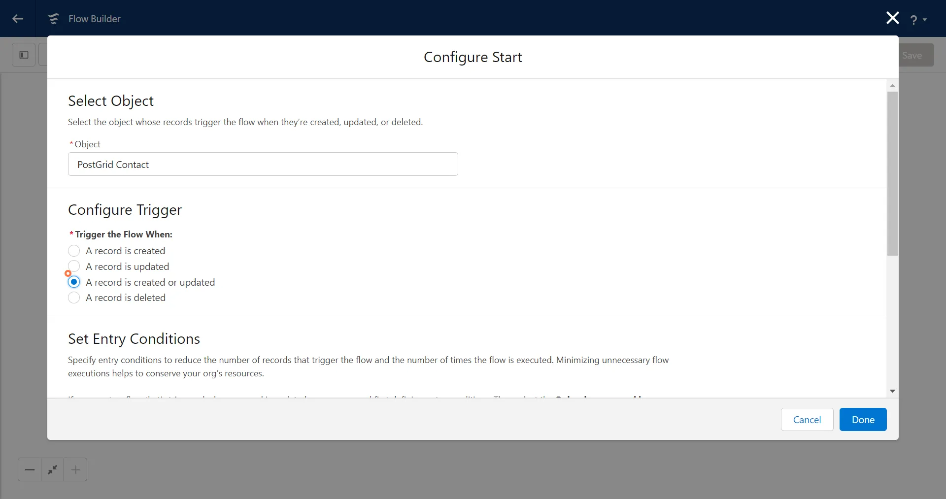 Section titled “6. Configure the Trigger and Set Entry Conditions. Once the trigger is configured click on Done”You can set any condition that you want to, for example, you want to trigger the flow for a contact from a specific country.