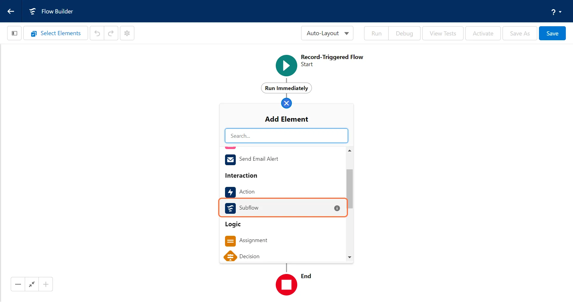 Section titled “1. Click on the ”+” sign and select “Subflow” in Interaction”