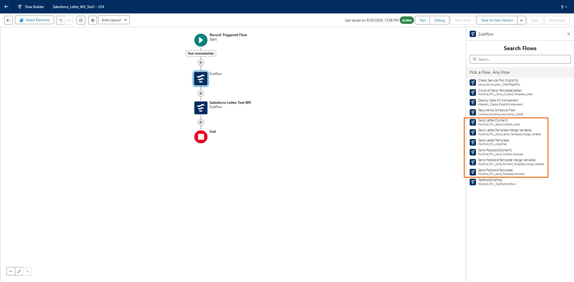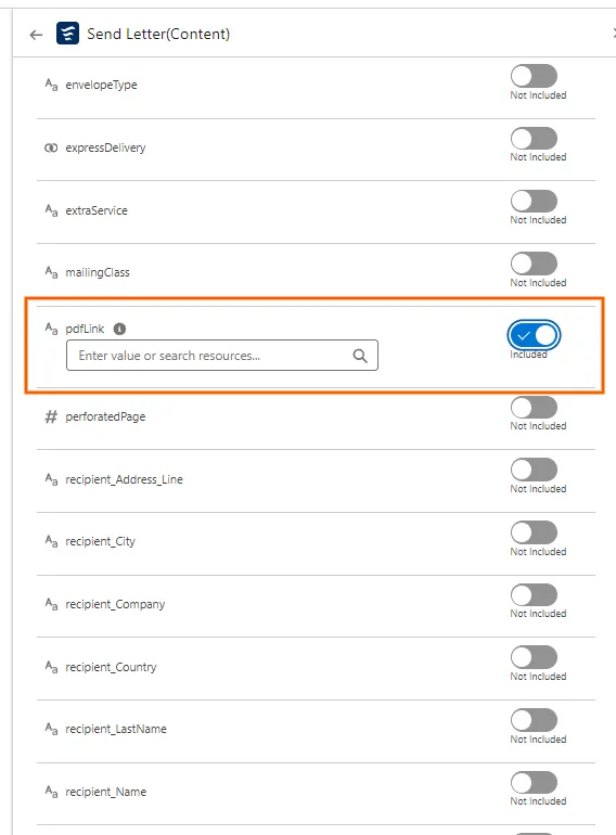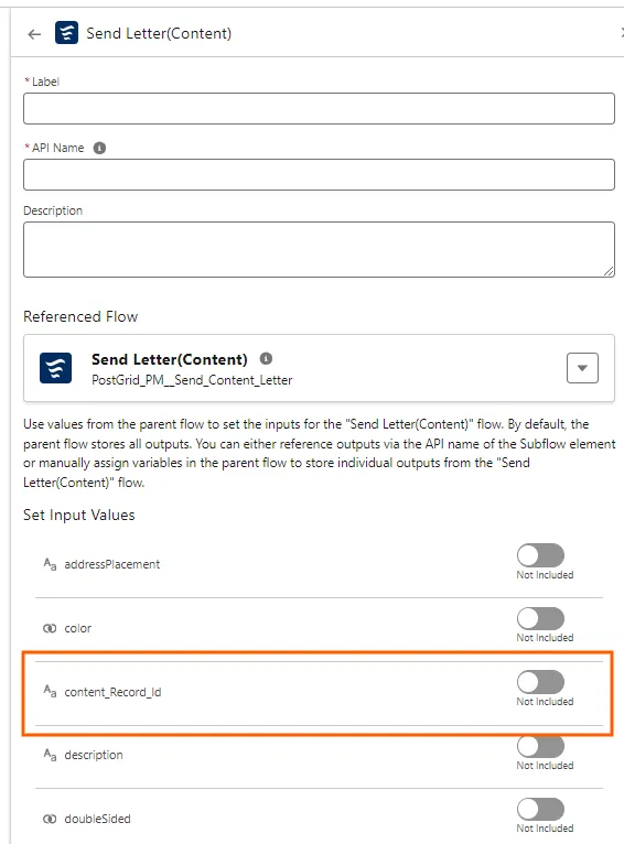 Section titled “Select the relevant Subflow”- If you are using a PDF please select “Send Letter(Content)” or “Send Postcard(Content)”