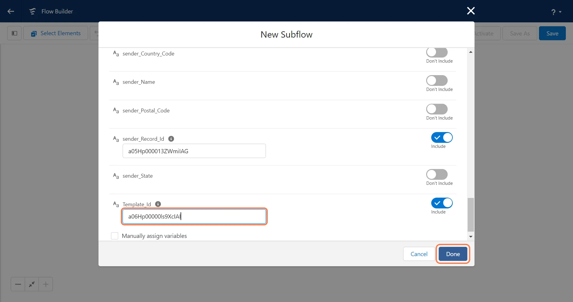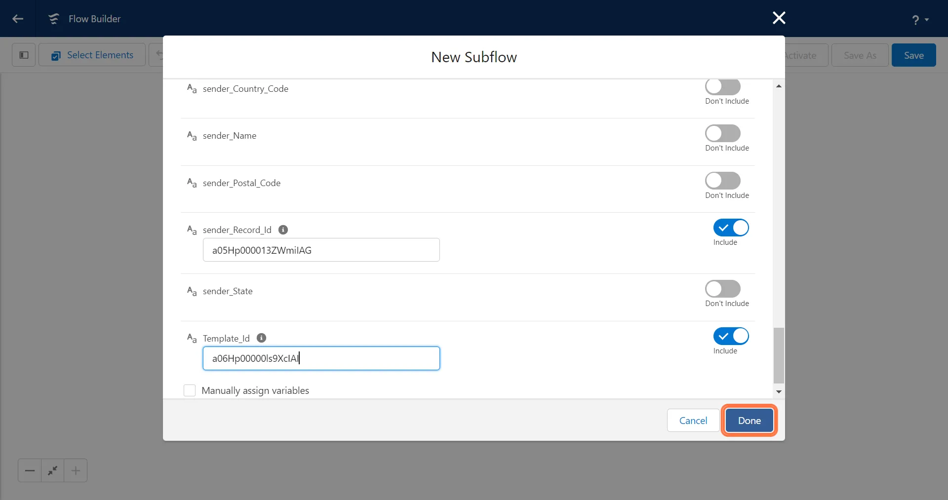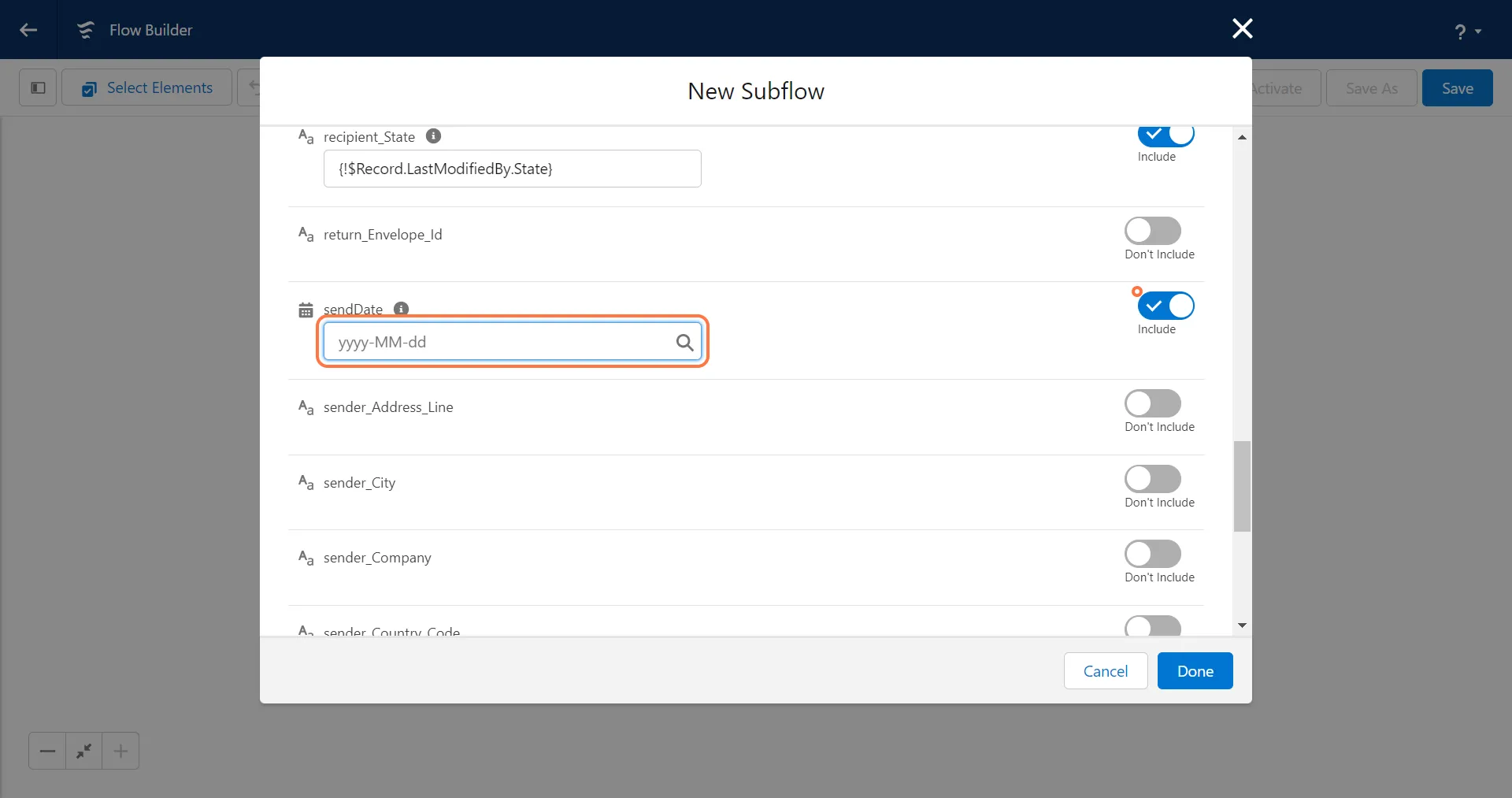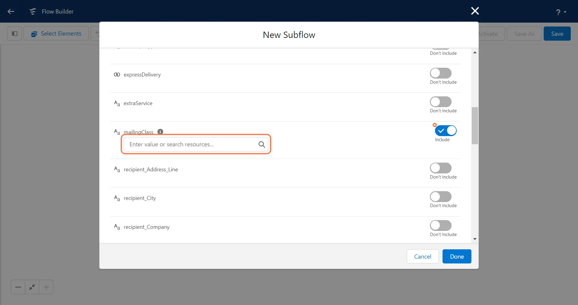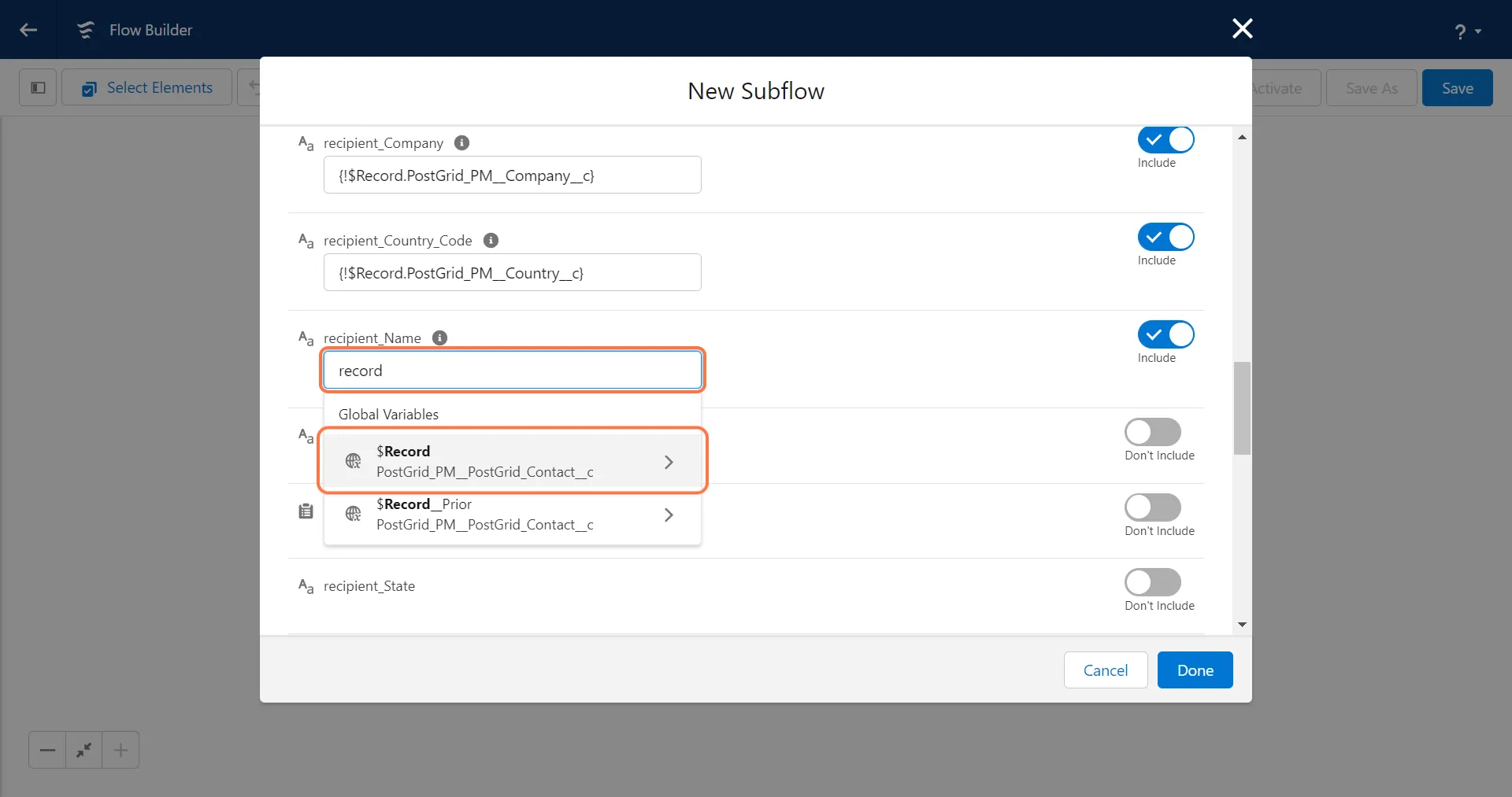 Due to Salesforce constraints, the input values for the following fields must be entered manually as text rather than mapping the global variable constants (True/False).