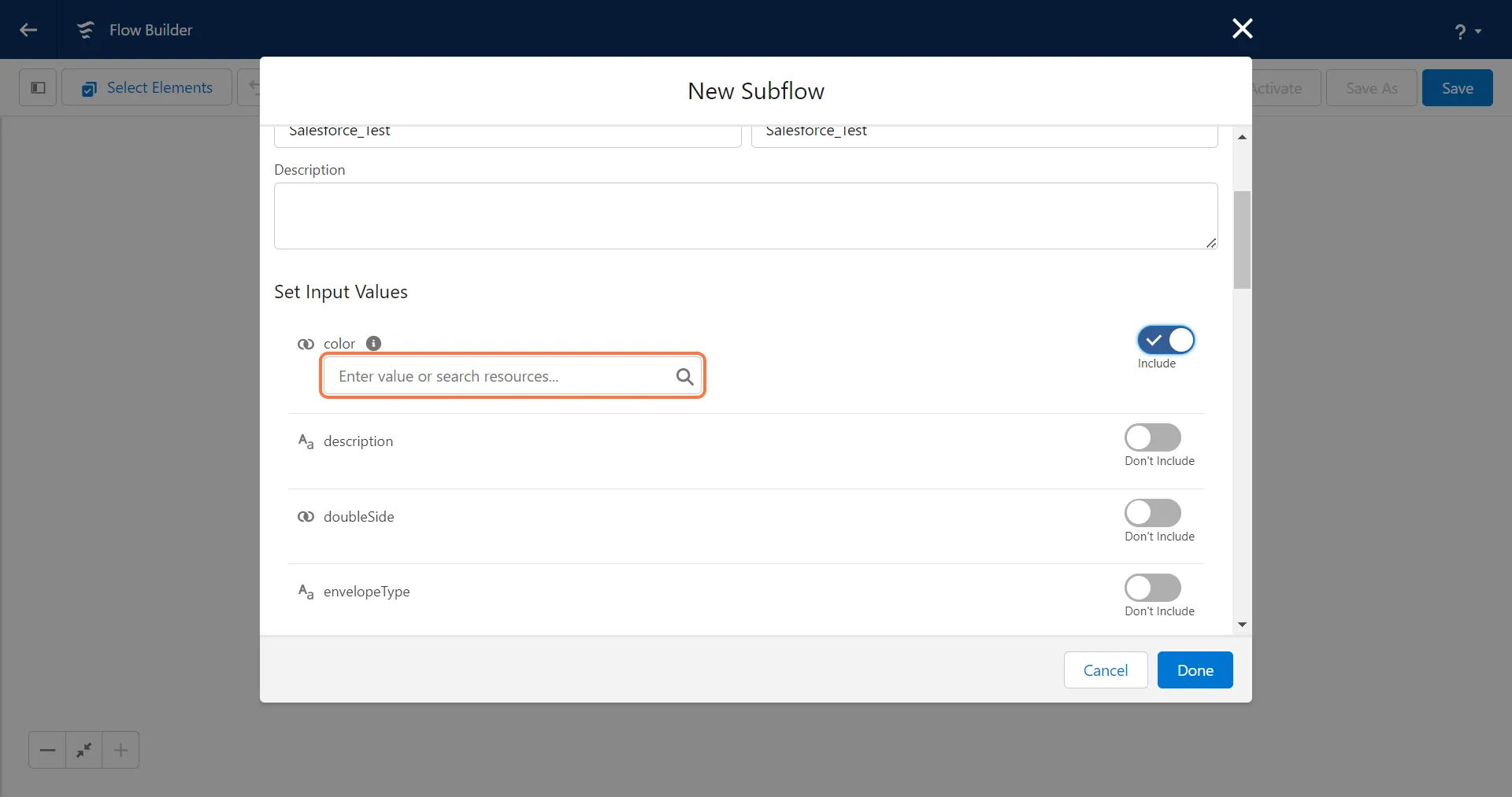 Section titled “2. To set any Input Values, first switch the toggle to include the input”