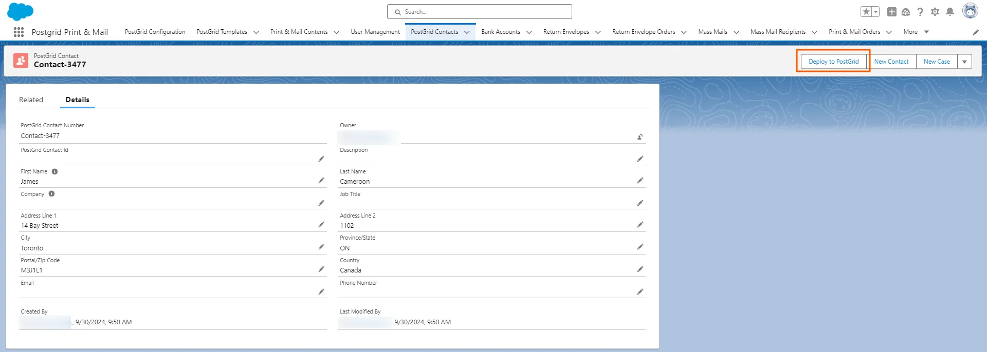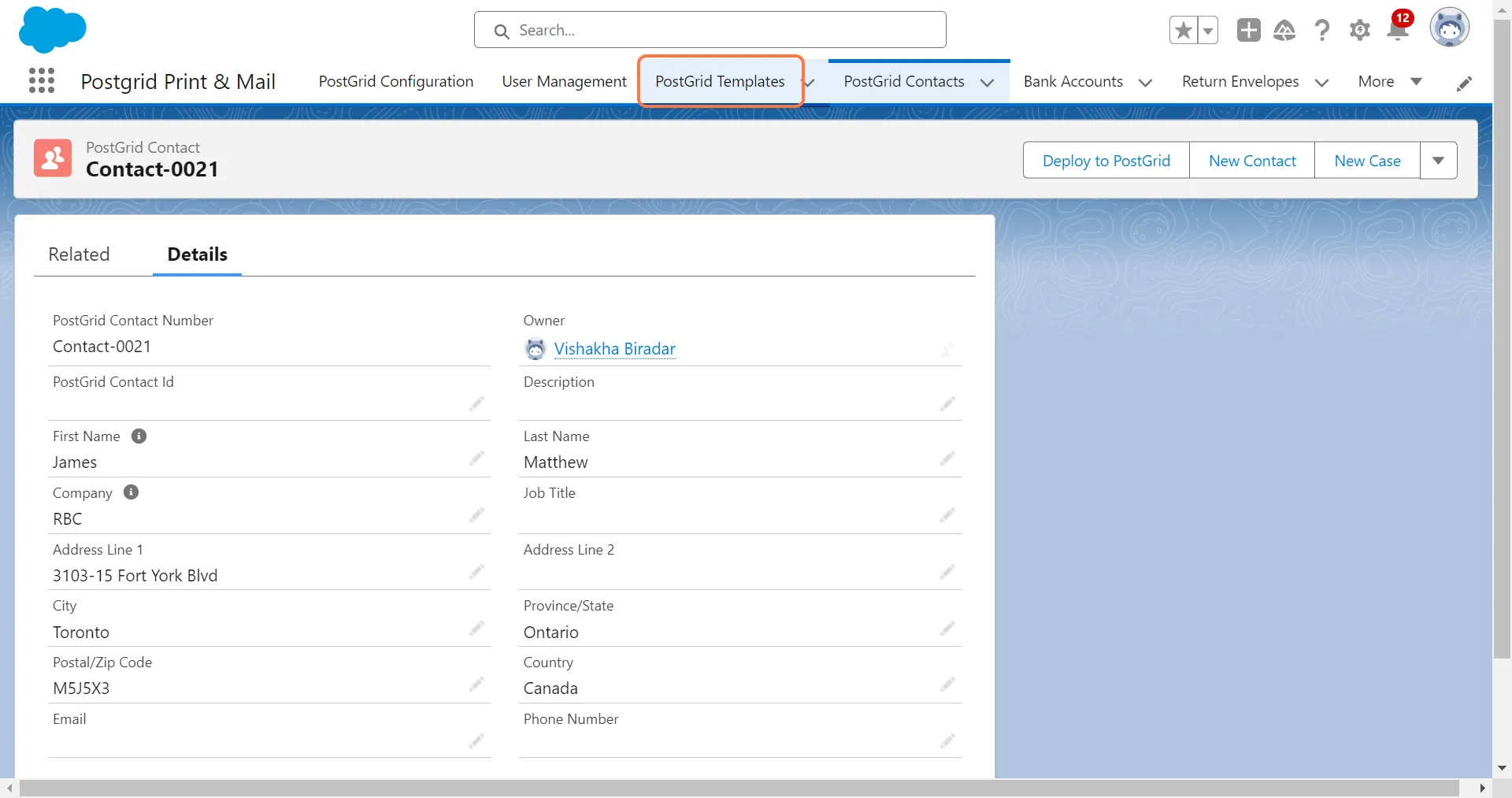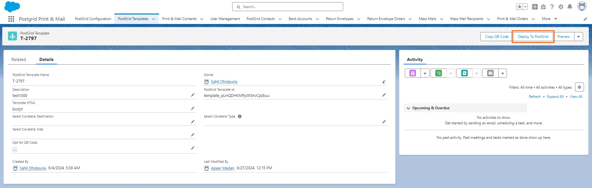 Section titled “Using an HTML template”If you are using an HTML template, you first need to create a template in Salesforce. Similar to adding the contact ID for the sender, for the template you first need to deploy the template on the PostGrid platform.