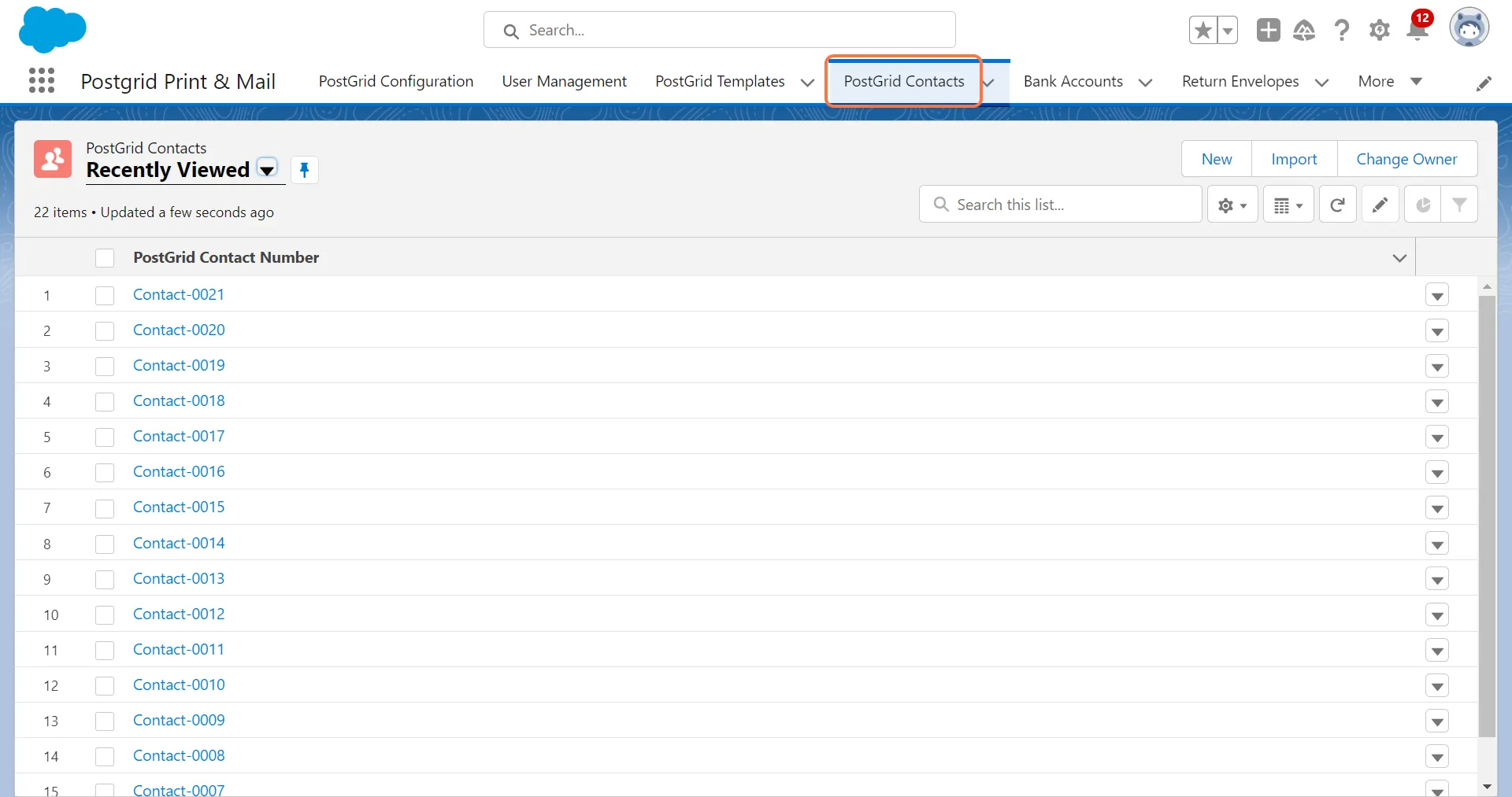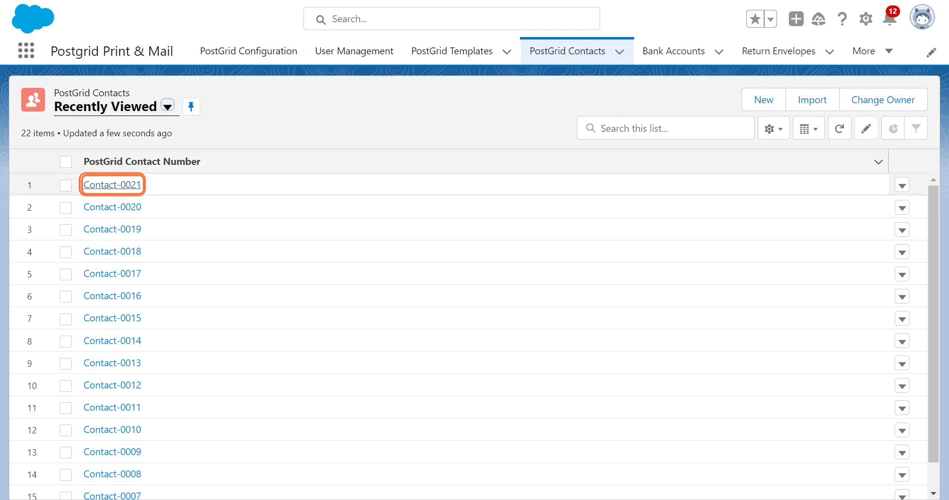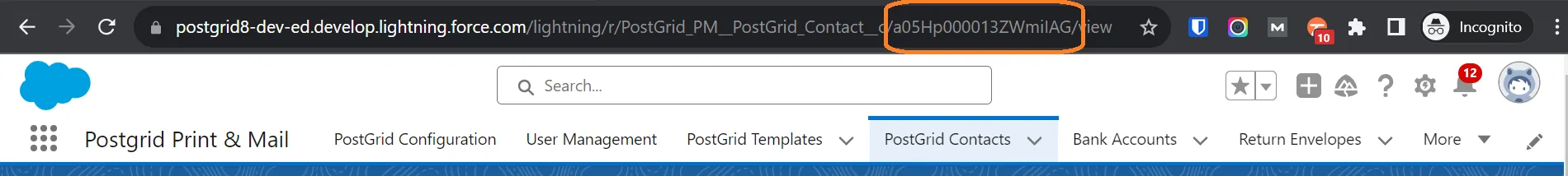 Section titled “1. Click on PostGrid contacts to get the record ID for the sender address”