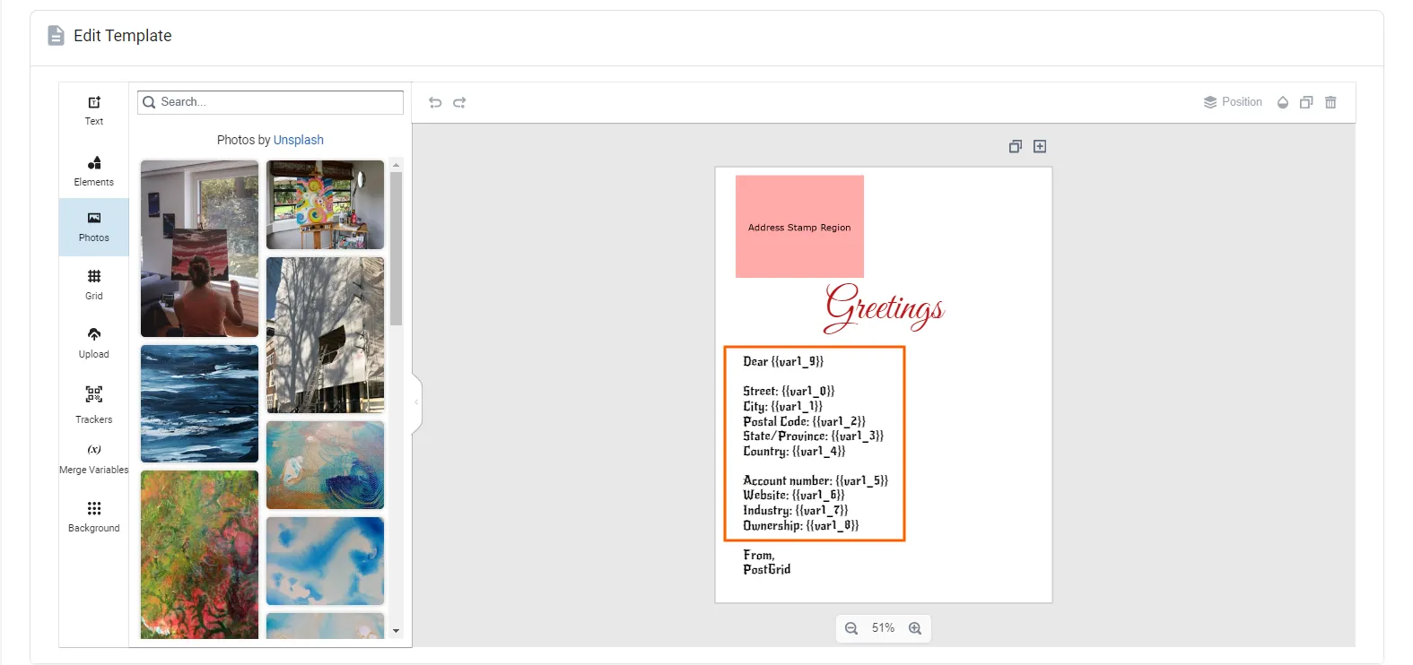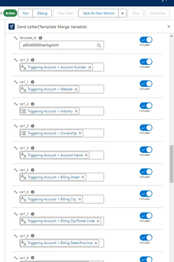 Section titled “Setting up the merge variables”Salesforce supports 40 merge variables from var1_0 to var4_9 for Letters and 20 merge variables from var1_0 to var2_9 for Postcards.