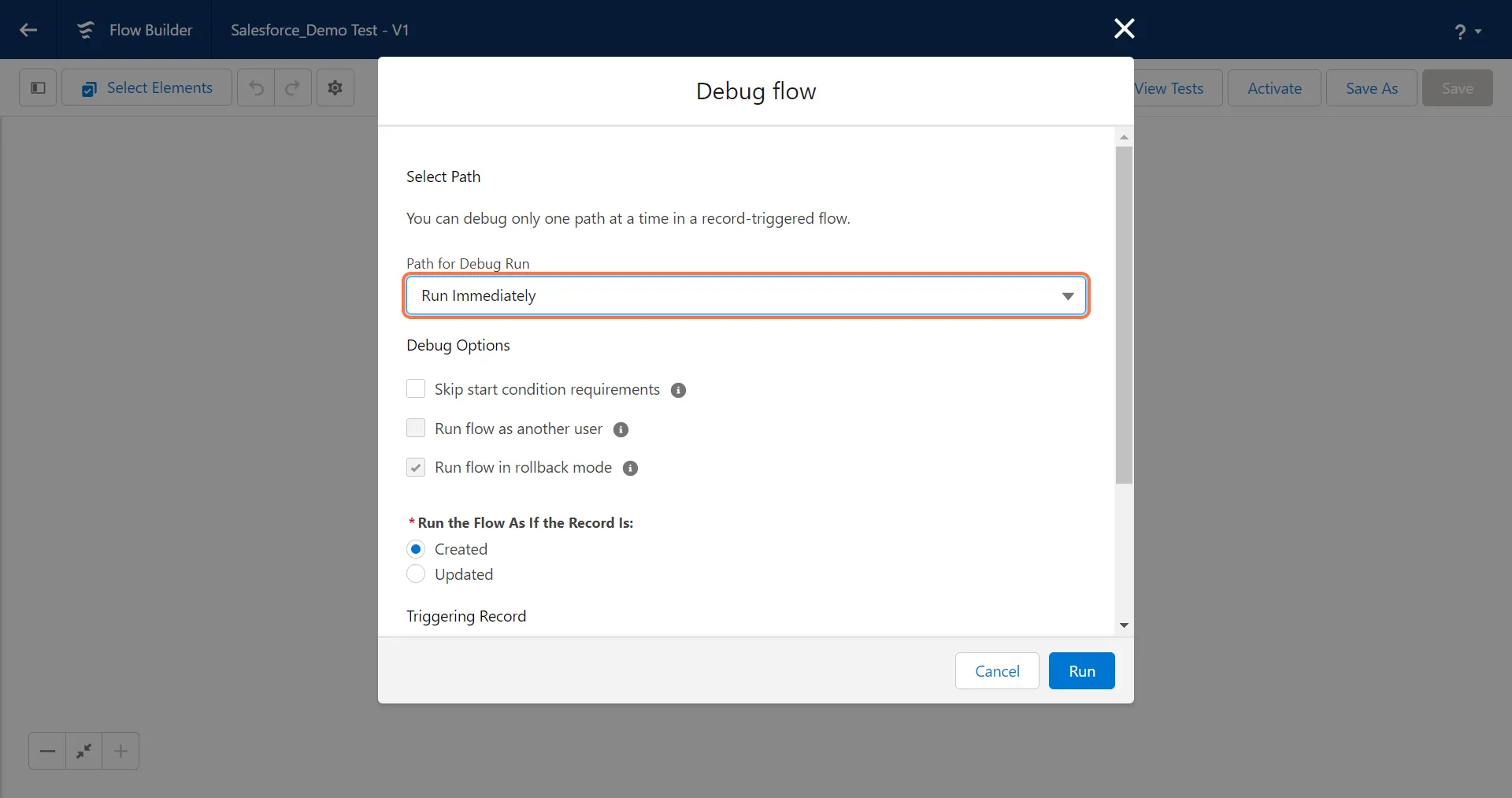 5. Select a custom object to run the workflow on and click on “Run”