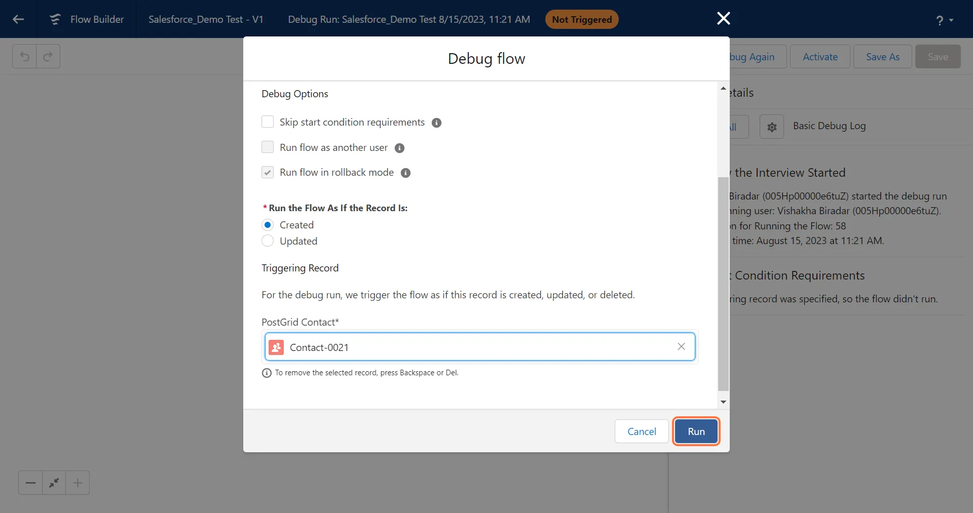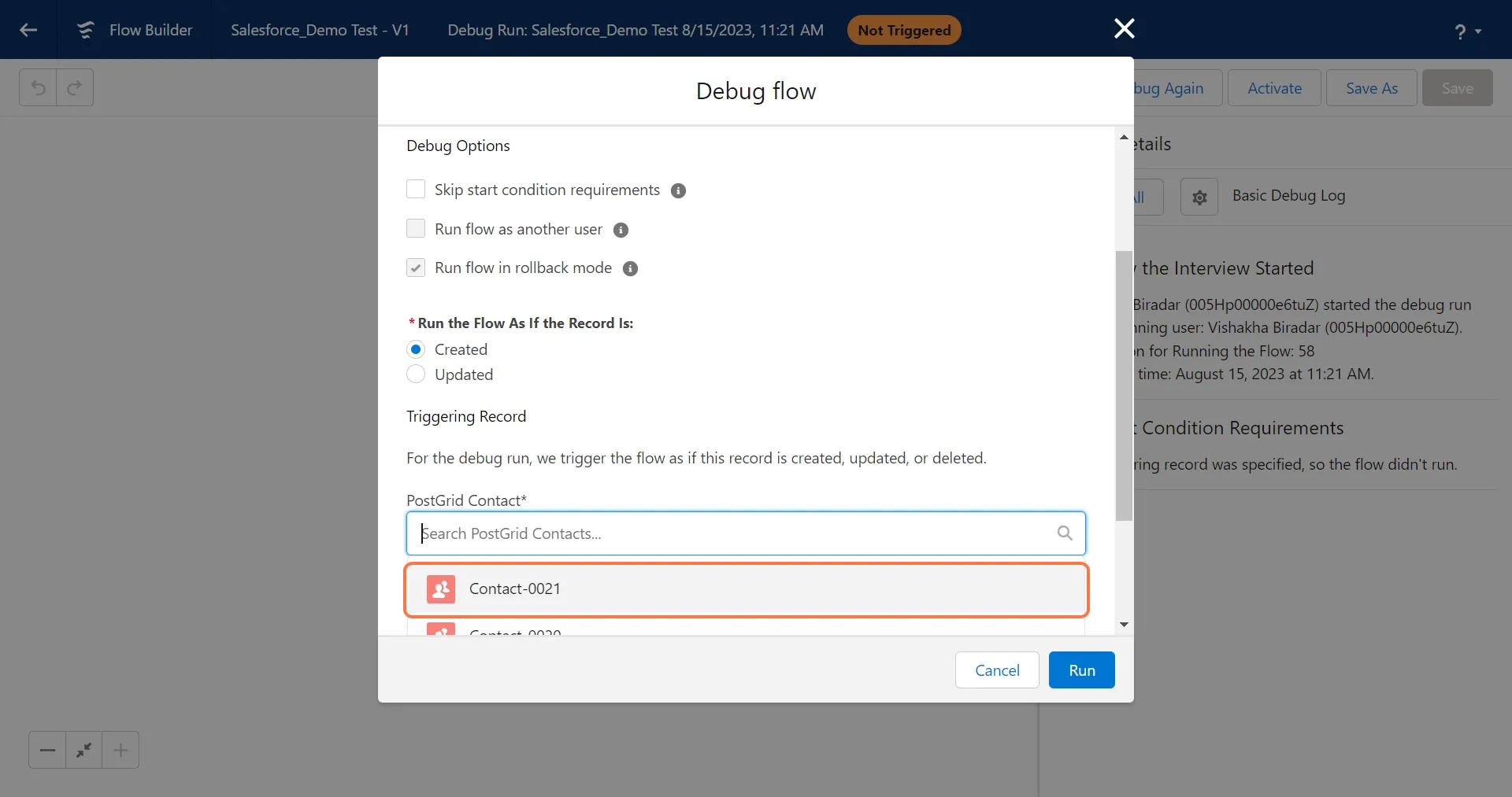 Section titled “5. Select a custom object to run the workflow on and click on “Run””Please ensure that you select a contact that meets the configured triggered conditions to ensure accurate testing.