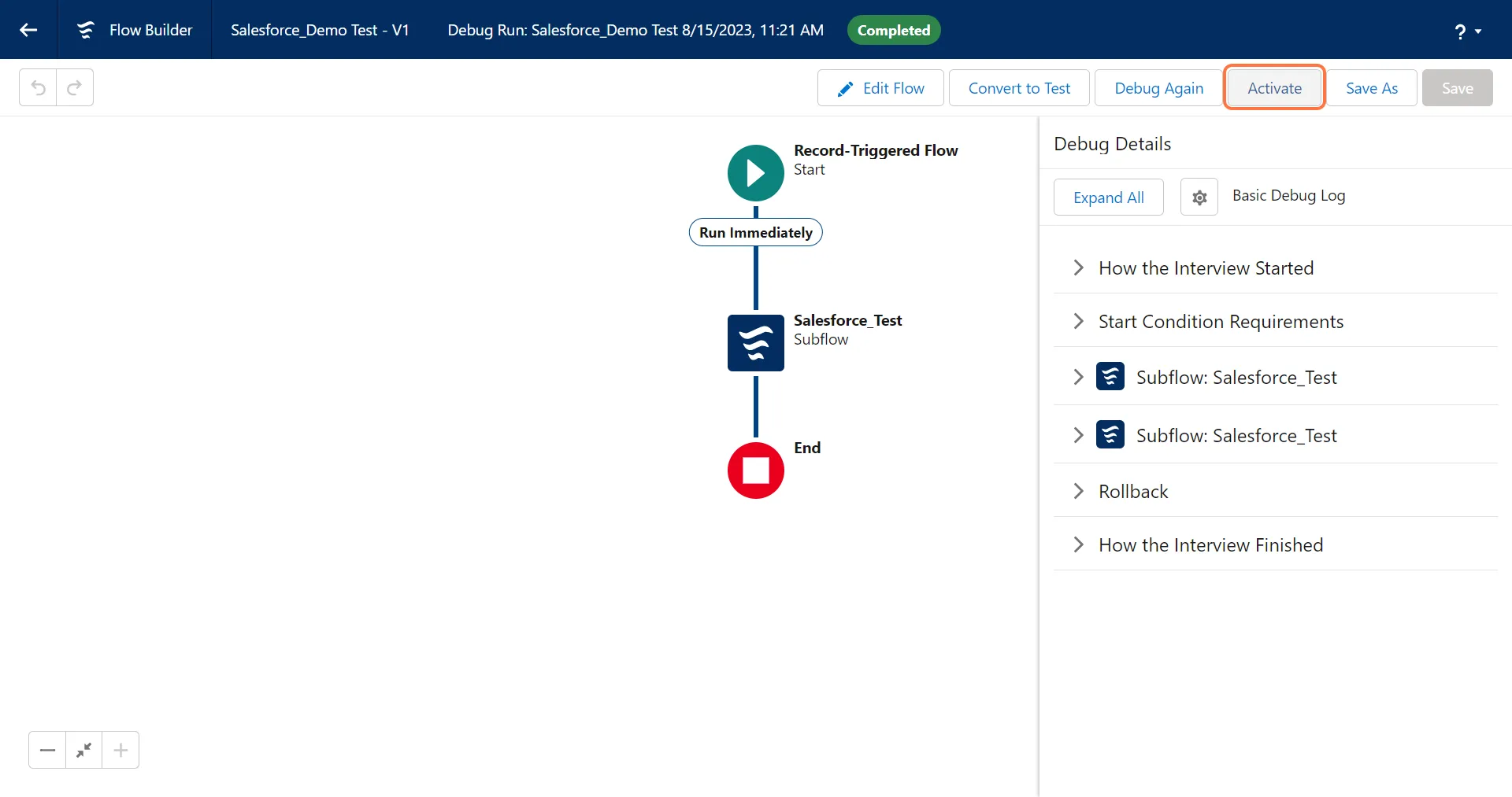 7. Click on “Activate” to activate the workflow