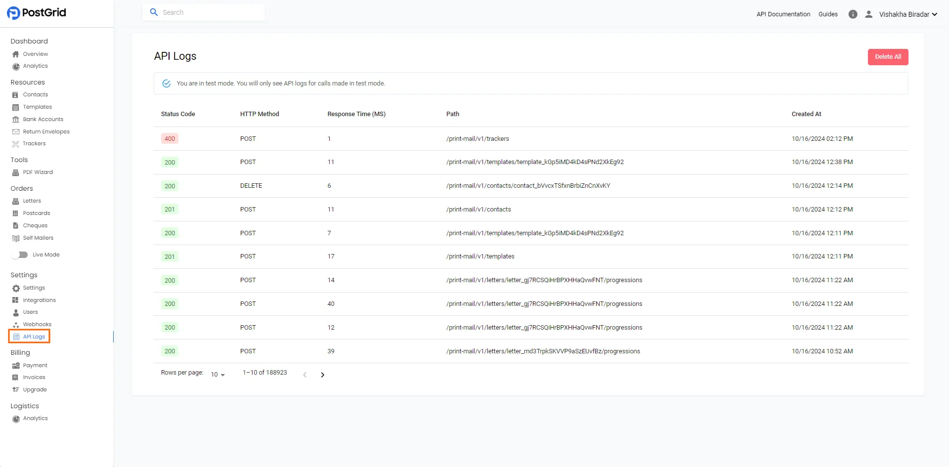 - You can also check the API logs in the PostGrid Dashboard
